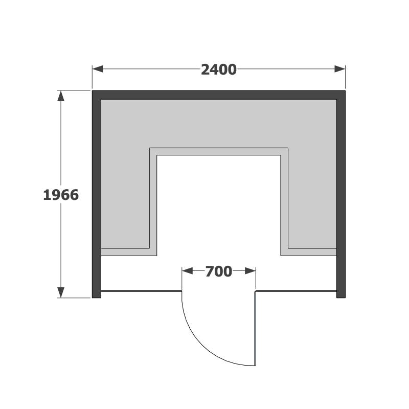 Prévoir un emplacement aux dimensions hors-tout de la cabine avec un espace supplémentaire de 2,5cm minimum tout autour de la cabine. Elle peut être entièrement montée de l’intérieur.