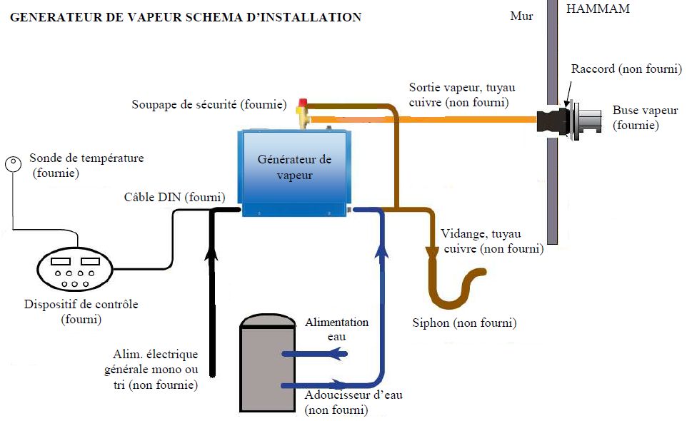 Prévoir un local technique pour le générateur de vapeur dans un endroit sec, à moins de 5m de la cabine avec alimentation/évacuation d’eau et alimentations électriques.