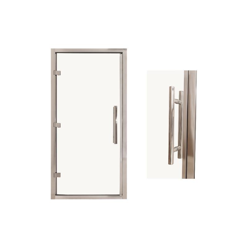 - Porte en verre sécurit trempé avec cadre, poignée et 3 charnières en aluminium, joint d’étanchéité sur le pourtour du cadre, entrée d’air sous la porte (porte réversible),