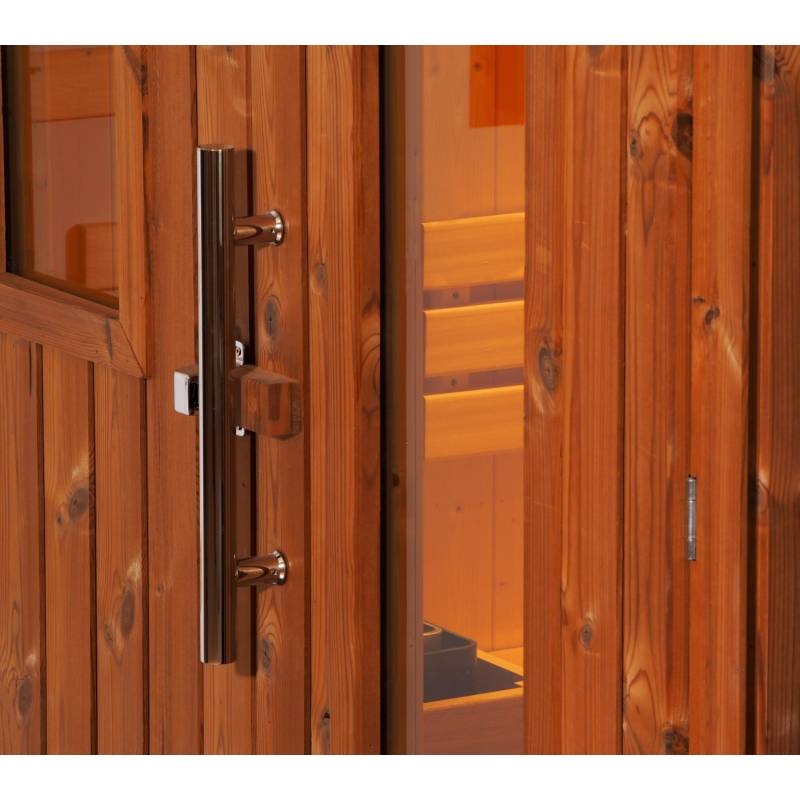 Les panneaux avec vitre (option) et la porte du sauna sont en verre sécurit trempé double vitrage 4/6/4mm. Le verre extérieur est réfléchissant; il laisse entrer la lumière naturelle dans le sauna tout en préservant l’intimité des utilisateurs. Le verre reflète le jardin et la cabine se fond harmonieusement dans le paysage. Le double vitrage réduit considérablement la perte de chaleur et le temps de chauffage.